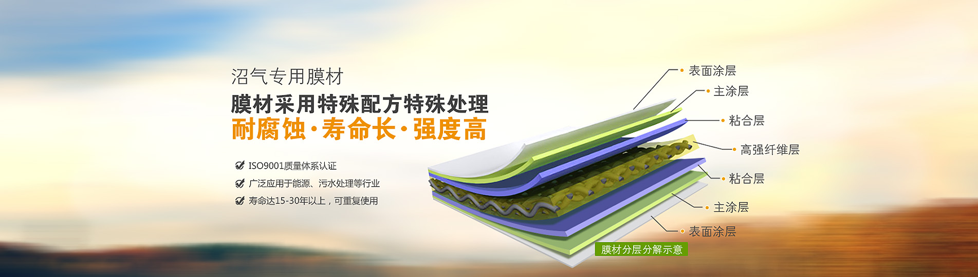 ● 雙膜氣柜材料同時具有抗沼氣腐蝕、抗紫外線和微生物的功能。常規(guī)使用壽命在10—25年以上,期間無需防腐處理.